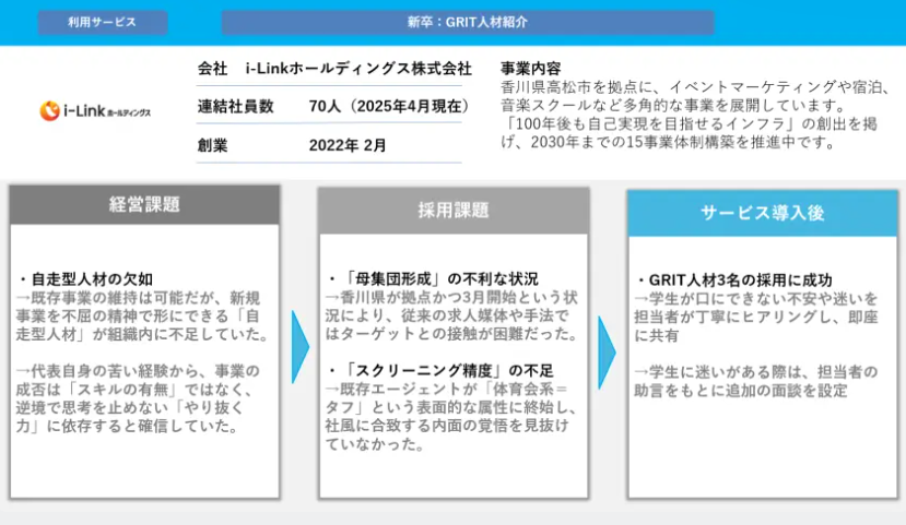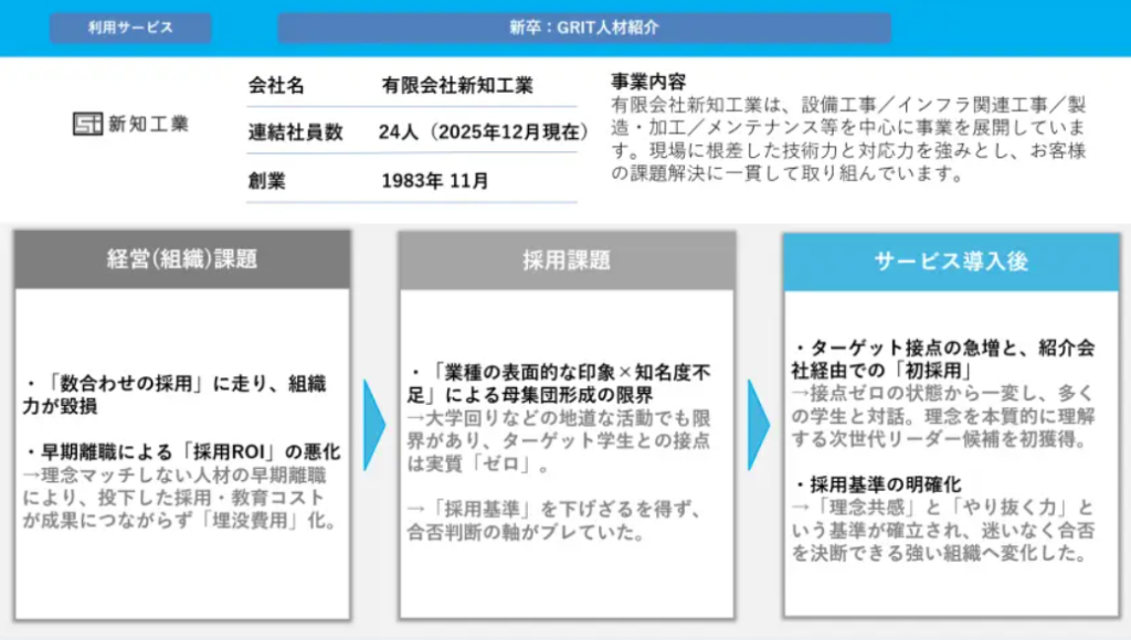 しかし、その新卒採用の開始時には、極めて高いハードルが存在していました。一般的な採用手法では獲得が困難な「自走型リーダー候補」を、いかにして短期間で3名獲得できたのでしょうか。スキル偏重の市場トレンドとは一線を画す、心理的特性(GRIT)を最優先した意思決定プロセスについて、具体的に解説します。