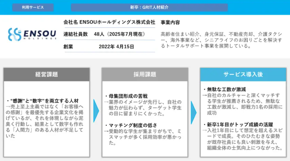 ENSOUホールディングスは、トータルサポート事業という、シニアライフのお困りごとを解決する独自のビジネスモデルを展開しています。その事業の独自性ゆえに、従来の大規模な採用イベントでは学生への認知形成に苦戦し、母集団形成とマッチングの質に課題を抱えていました。