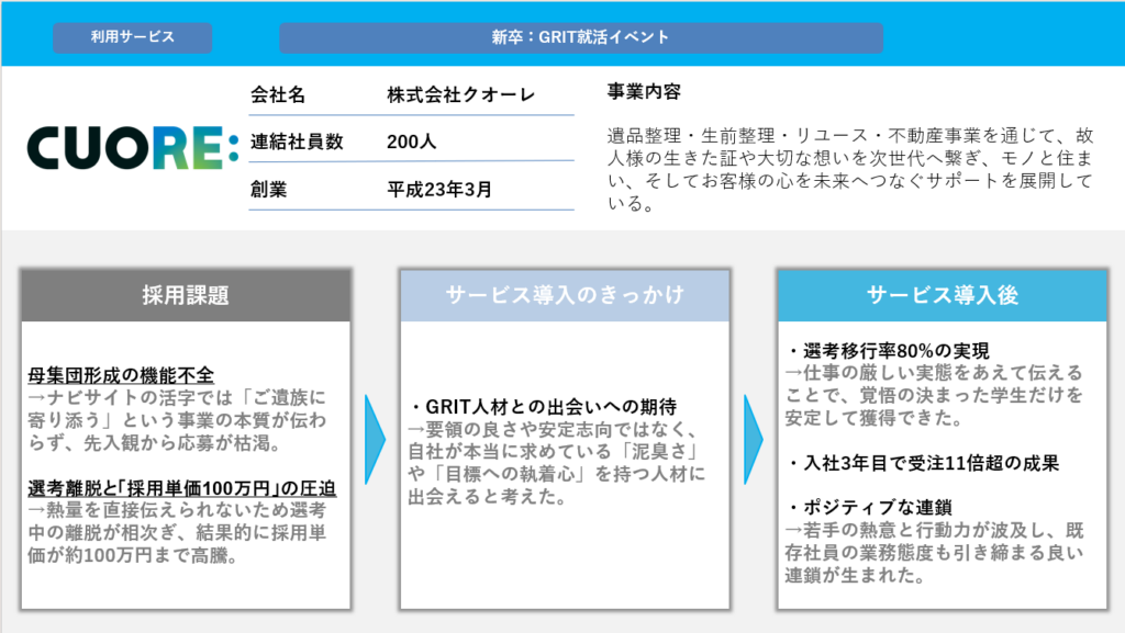 知名度不足に課題を抱えていたベンチャー企業が、いかにして業界平均を遥かに凌駕する人数のGRIT人材を採用し、不屈集団へと進化を遂げるまでの舞台裏に迫ります。